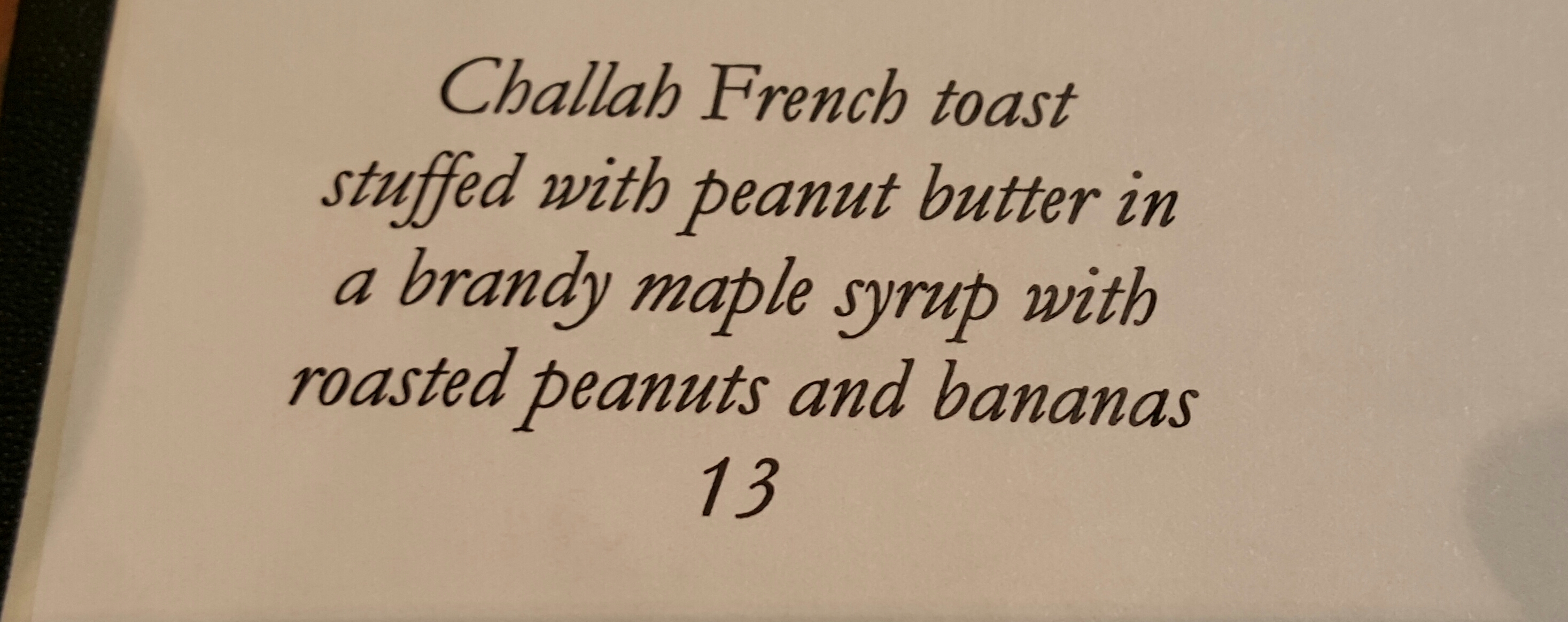 Last night was spent at a Bed and Breakfast. This was my first BnB and it was a terrible experience. I won’t name the location because, well, that’s not what this is about, but it was bad. The mattresses were lumpy, the room was sweltering, and the fly (thankfully only the one) was persistent. So, this morning, we opted out of the next two nights there, booked two rooms at a local chain, and agreed to forge anew for breakfast at a place my sister swears is the bomb.