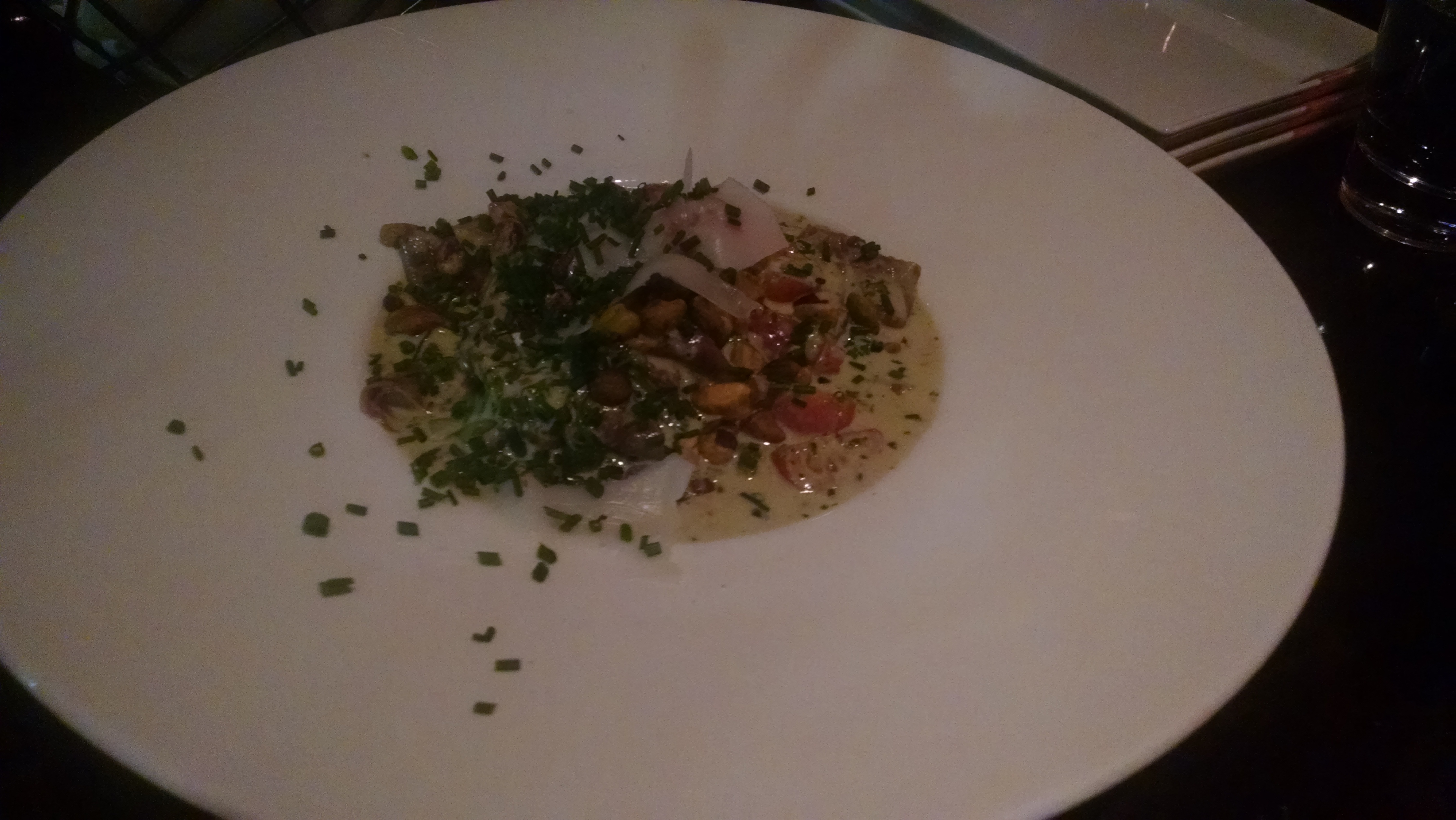 Customarily, Mom ordered the only dish on the menu that had beets, although it was different. This was a beet pappardelle – a thick flat ribbon-like pasta in this dish made from beets. It was covered in an arugula pistachio pesto with roasted tomato and drunken goat cheese. The difference in the consistency with each bite, whether you had only pappardelle, or had a half a tomato, or a pistachio, made all the difference in the world. If I were able to recreate the sauce alone, I think I could open my own restaurant. It was very unlike the beet dishes we’re used to, which are usually beet salads with an occasional roasted beet.
