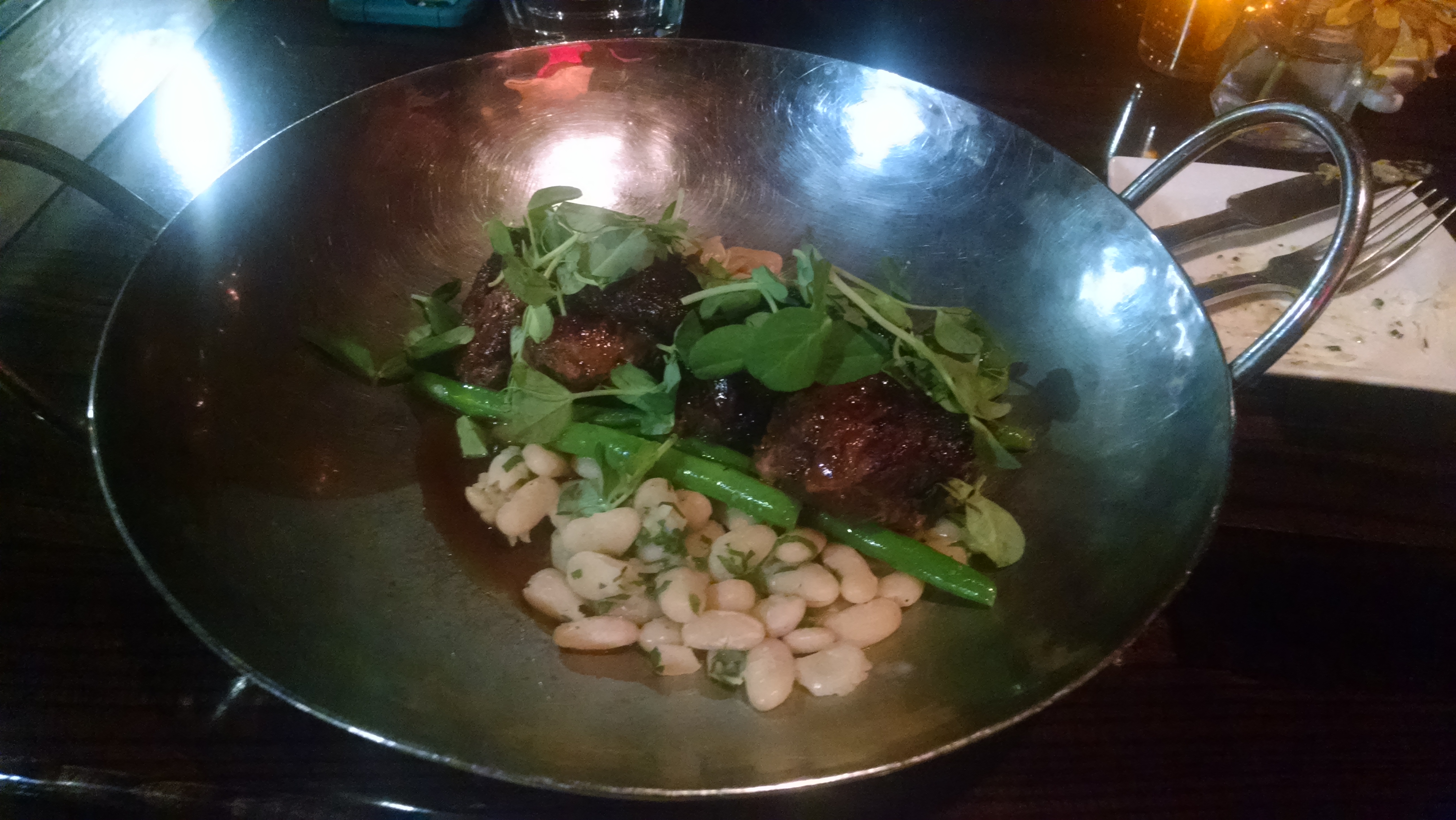 Emily had hog’s cheeks with… wait. Hold up. Hog’s cheeks? Yes, this cut of meat is the masseter muscle and is particularly tender and succulent. It was served with braised white beans, blistered haricot verts (apparently everyone calls them that here), and a red onion marmalade.