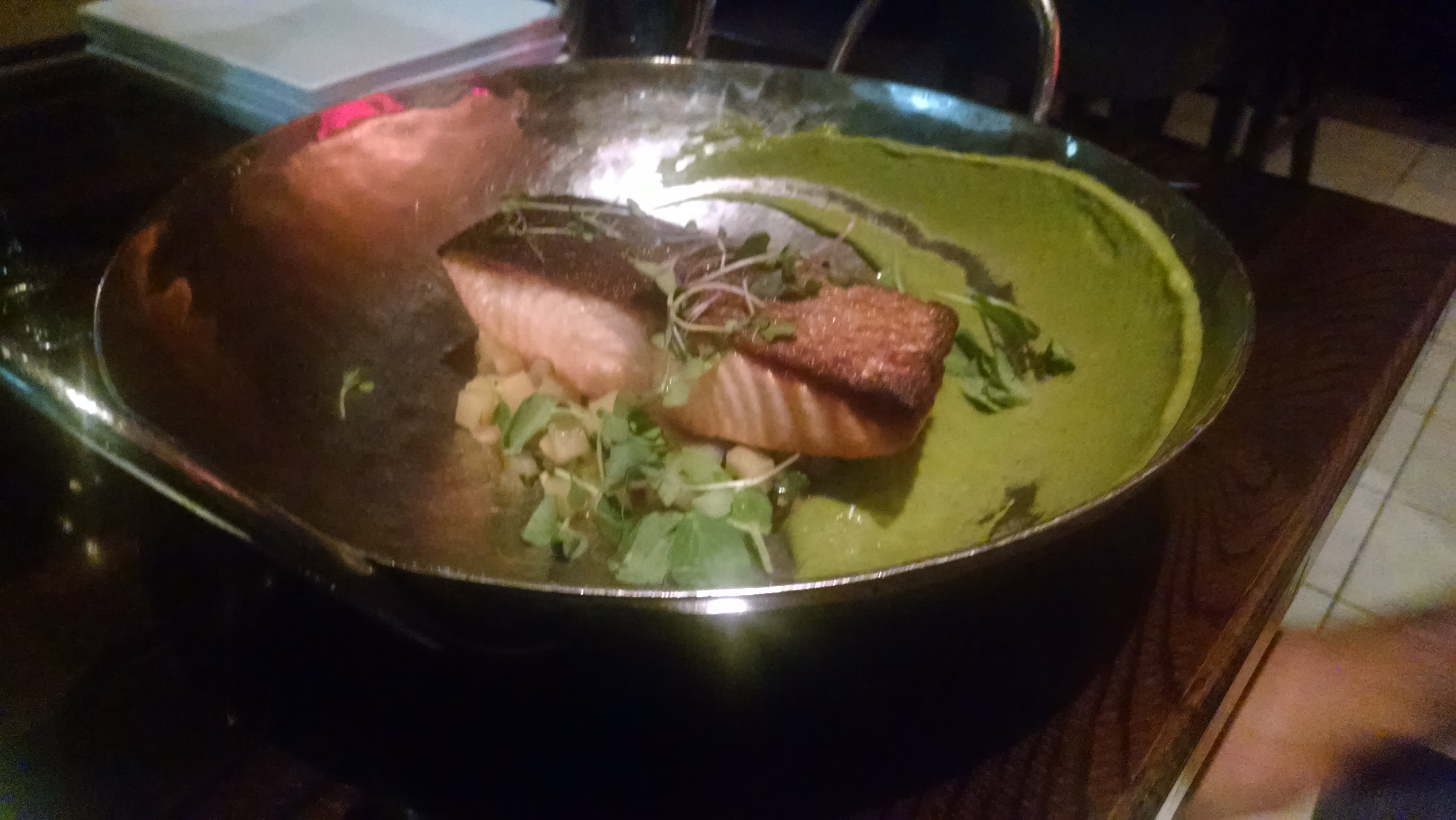 I ordered roasted salmon on a potato and chorizo risotto with an avocado spread. The risotto was unlike anything I’ve ever had before – unlike any risotto I’ve ever had before. The chorizo was perfect – so much so it had to have been made in house. I just watched one of those shows with the fat guy and the white hair that sticks straight up and wears his sunglasses on the back of his head – in which someone was showing how to make your own chorizo. It looks like quite the process.