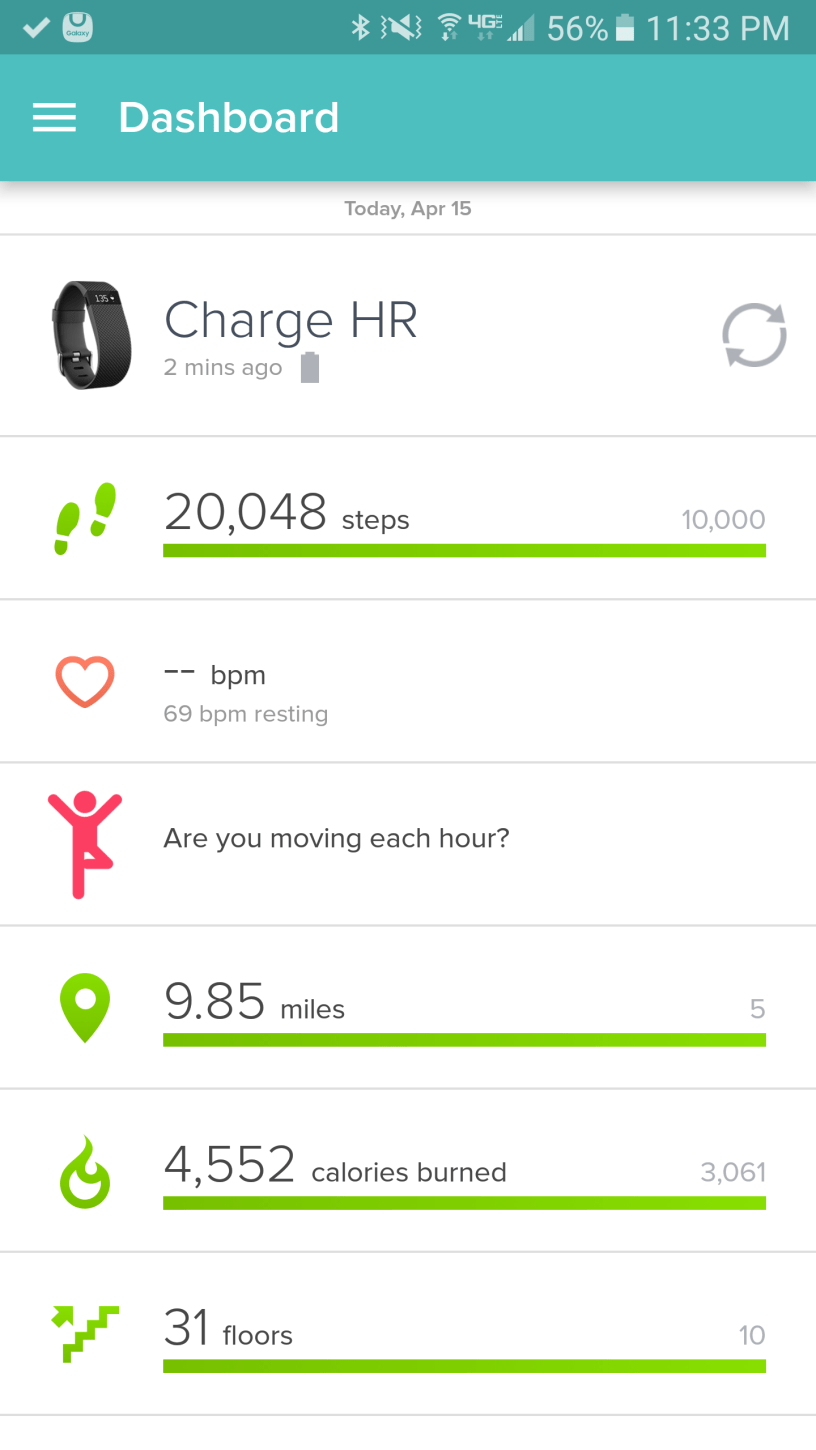 Here are my super-awesome stats from the day, I was pumped to surpass 20k steps, and 31 sets of stairs was fantastic! I’ve recommended FitBit (or similar items) to patients for attempted weight loss, and this is a great demonstration of it. Knowing that 20k steps = 10mi (almost) = 4,500kcal, that tells me about how much I should be exercising and moving to account for the calories that I eat. There is a lot of physiology, psychology, and endocrinology that goes into weight loss, but at the end of the day it’s all about calories in vs. calories out, and these contraptions, love ’em or hate ’em, they give you an estimate to help understand the second part of that equation.