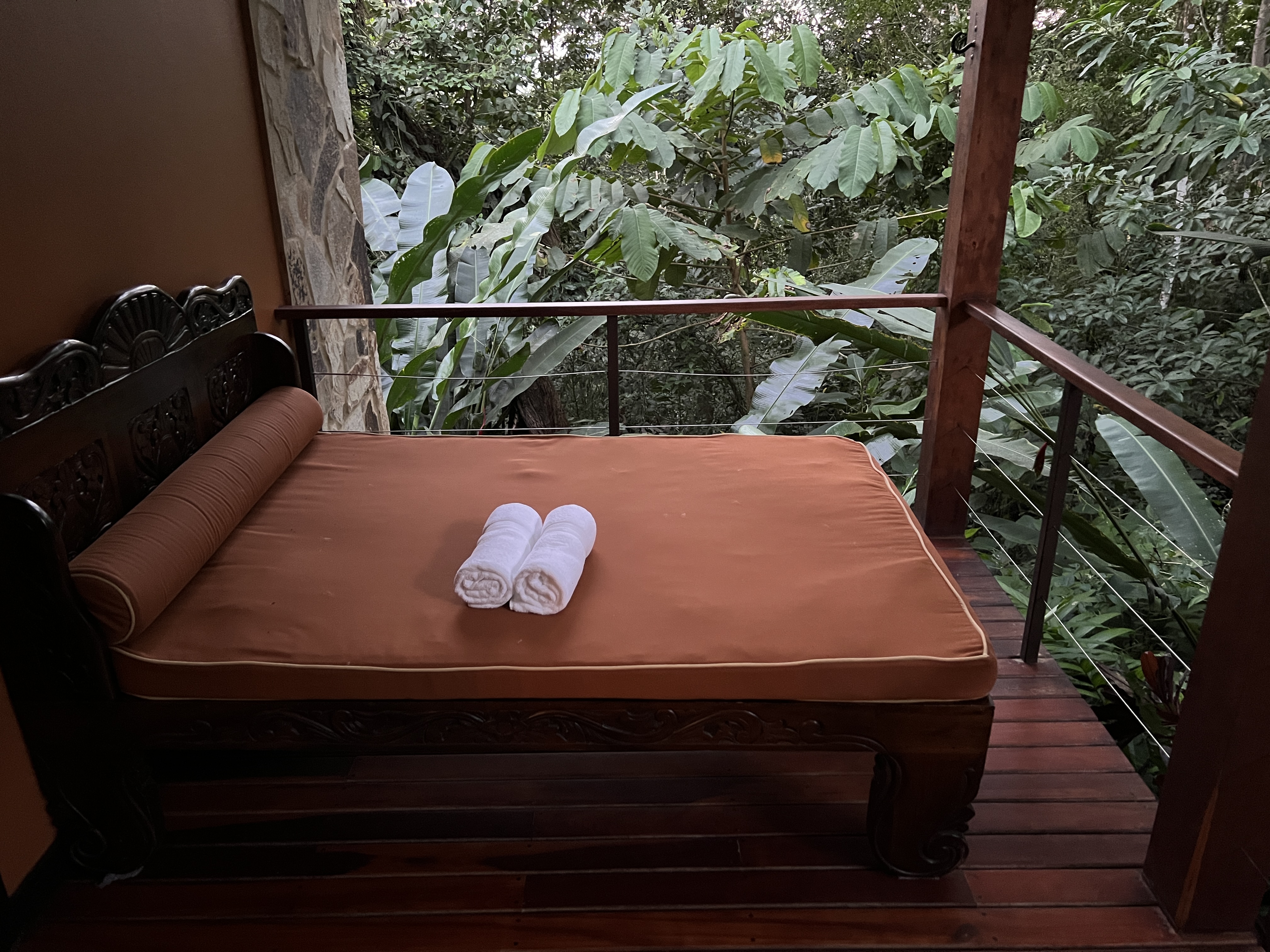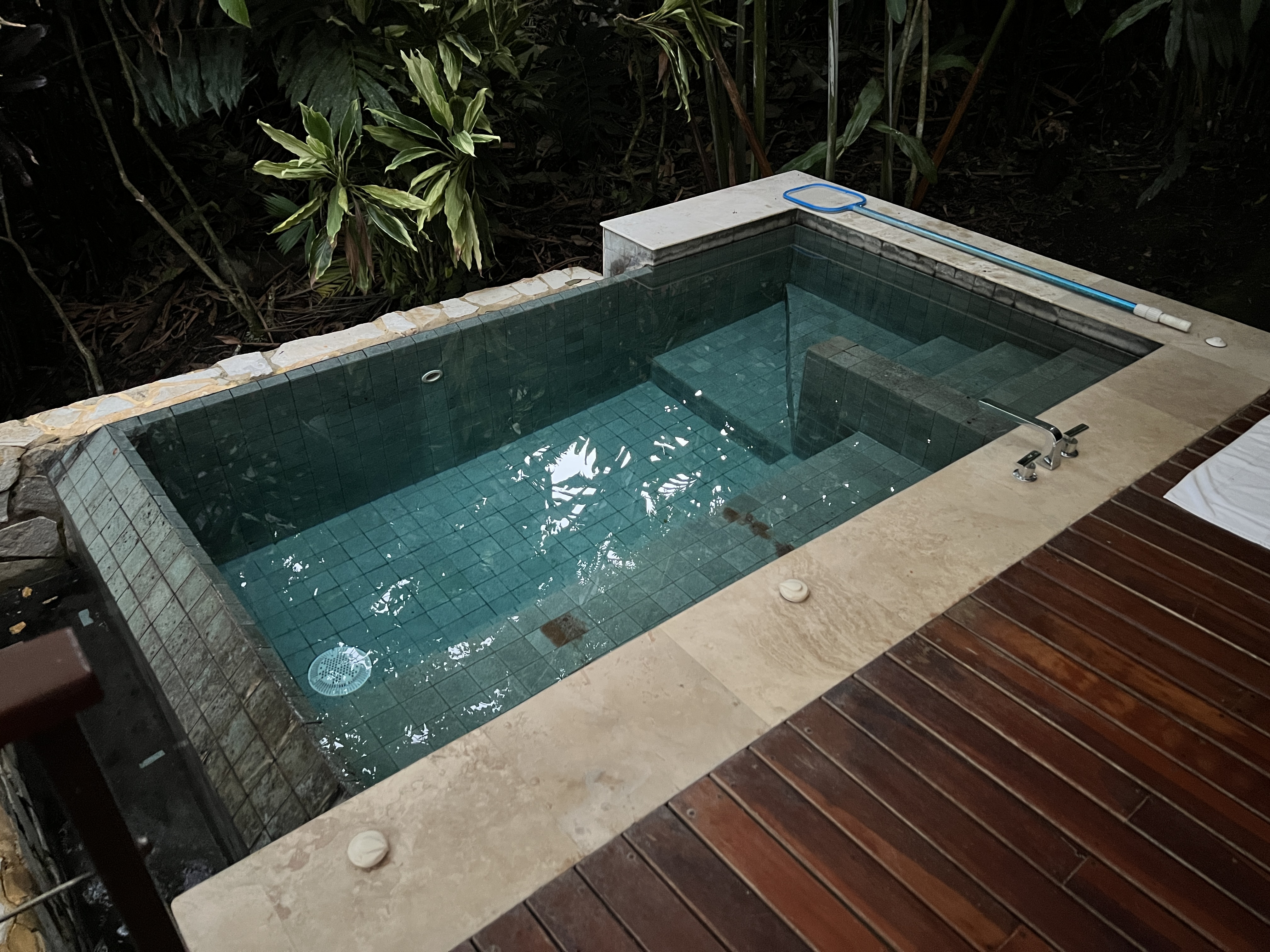 I was not adequately prepared for our villa. We have a private hot-springs fed pool, hammock, and reading couch outside, outdoor shower on the opposite side, giant walk-in rain shower in the bathroom, and plenty of room for two introverts to be close to one another. Over the pool is lush jungle.
